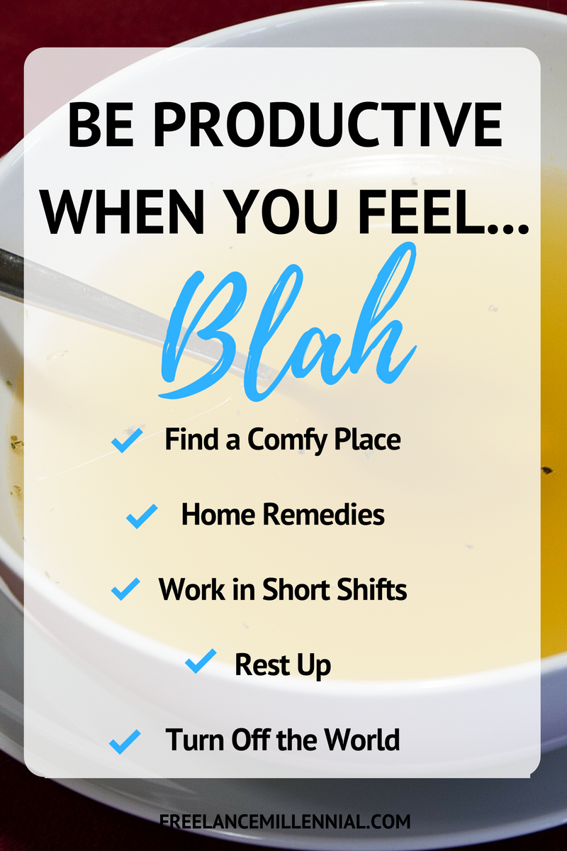 There’s no shame in grannyin’-it for a day (or two). Eat soup, put your feet up and rest. The beauty of working from home is no one will care how gross you look or smell (So go ahead and slather yourself in VapoRub). Try doing that in an office setting and you get the office complainers for sure.